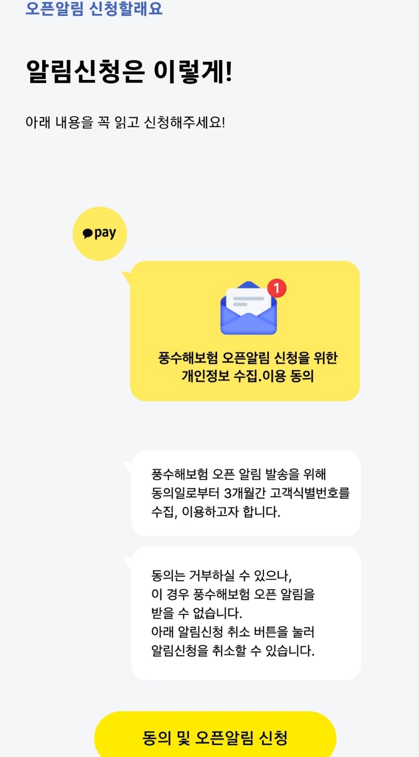 협약 후 시스템 개발등 준비를 마치고 4월 중 접수시작예정입니다. 3월 15일부터 카카오페이 앱의 "풍수해보험" 구분란 하단에 접속하여 미리 알림 신청을 할 수 있습니다.