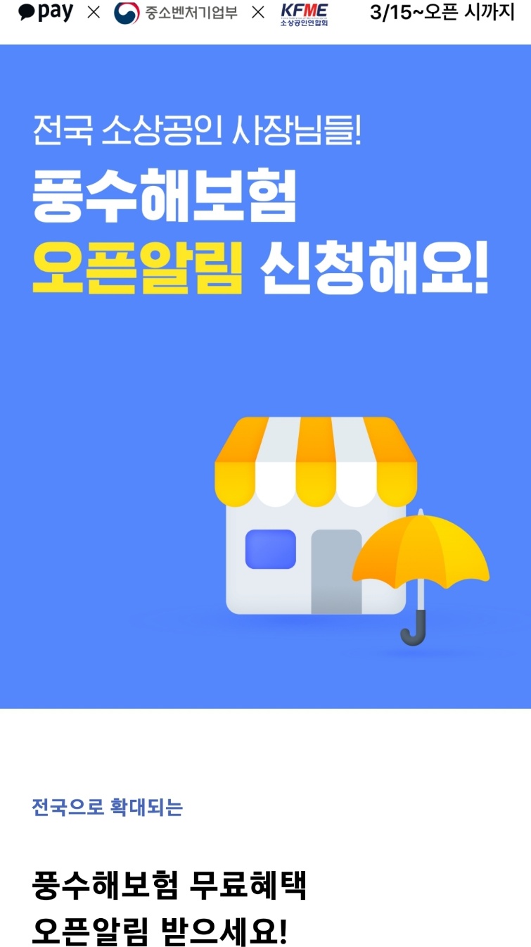 -> 현재는 서울시 소상공인만 접수가능하지만 4월부터는 풍수해보험 전액 지원사업을 전국으로 확대하여 소상공인 누구나 선착순으로 가입가능