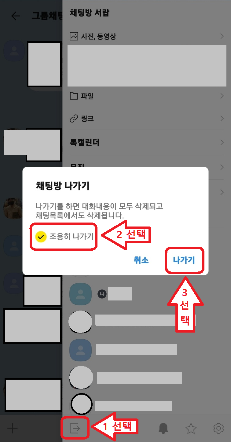 6️⃣ 채팅방 나가기 창이 뜨고 "조용히 나가기"를 눌러 노란색 체크박스로 변경된 후 나가기 버튼을 선택하면 카카오톡 조용히 나가기가 실행됩니다.